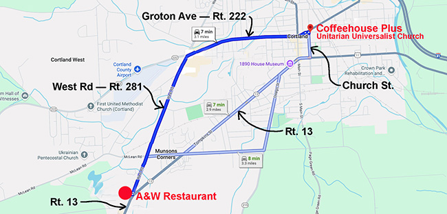 While in the area, you also have the opportunity to visit the legendary (and also historic) A&W Restaurant, built in the early 1960s, and still proudly using 1960s-era telephones to order food inside (or “car hops” to bring food to your car). It’s at the intersection of Rt. 13 and Rt. 281.